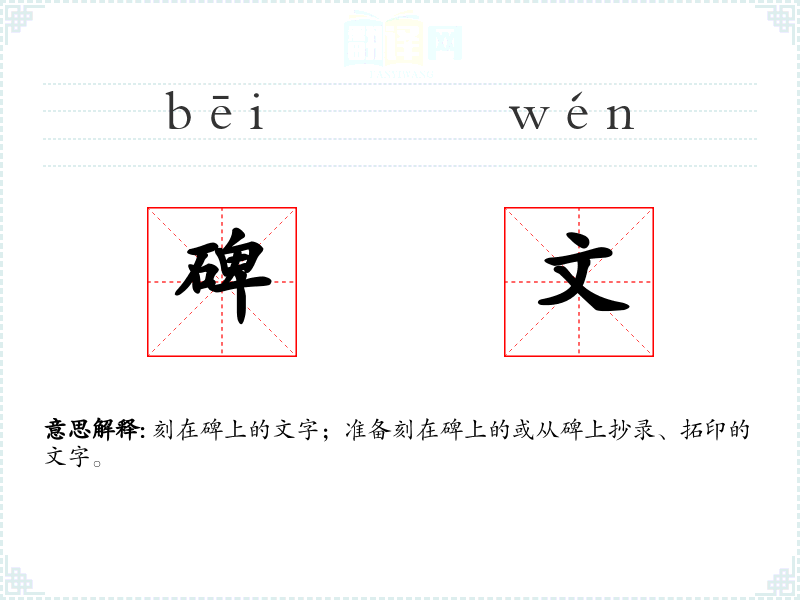 刻在碑上的文字;准备刻在碑上的或从碑上抄录、拓印的文字。