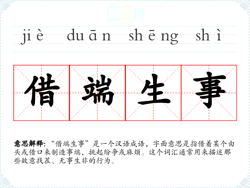 “借端生事”是一个汉语成语,字面意思是指借着某个由头或借口来制造事端,挑起纷争或麻烦。这个词汇通常用来描述那些故意找茬、无事生非的行为。