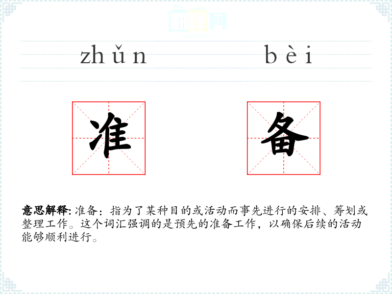 准备:指为了某种目的或活动而事先进行的安排、筹划或整理工作。这个词汇强调的是预先的准备工作,以确保后续的活动能够顺利进行。