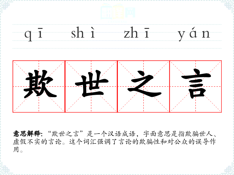 “欺世之言”是一个汉语成语,字面意思是指欺骗世人、虚假不实的言论。这个词汇强调了言论的欺骗性和对公众的误导作用。