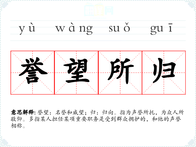 誉望:名誉和威望;归:归向。指为声誉所托,为众人所敬仰。多指某人担任某项重要职务是受到群众拥护的,和他的声誉相称。