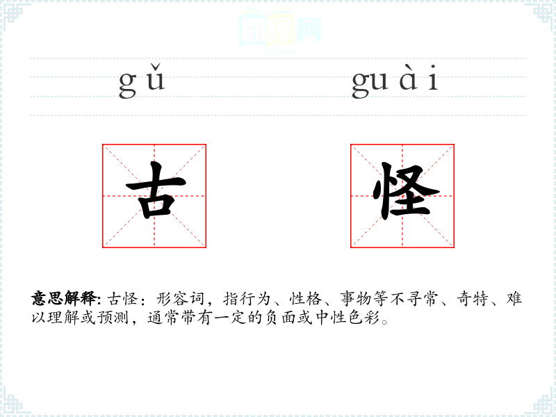 古怪:形容词,指行为、性格、事物等不寻常、奇特、难以理解或预测,通常带有一定的负面或中性色彩。