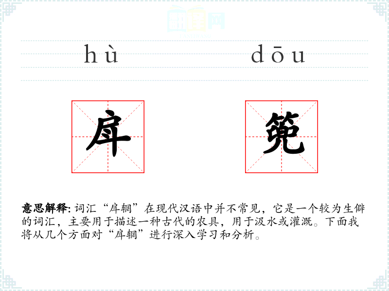 词汇“戽辋”在现代汉语中并不常见,它是一个较为生僻的词汇,主要用于描述一种古代的农具,用于汲水或灌溉。下面我将从几个方面对“戽辋”进行深入学*和分析。