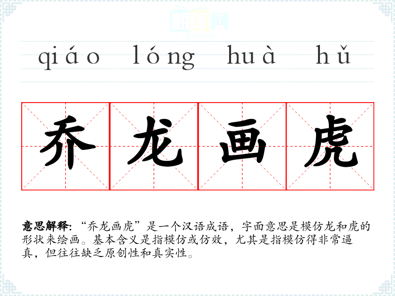 “乔龙画虎”是一个汉语成语,字面意思是模仿龙和虎的形状来绘画。基本含义是指模仿或仿效,尤其是指模仿得非常逼真,但往往缺乏原创性和真实性。