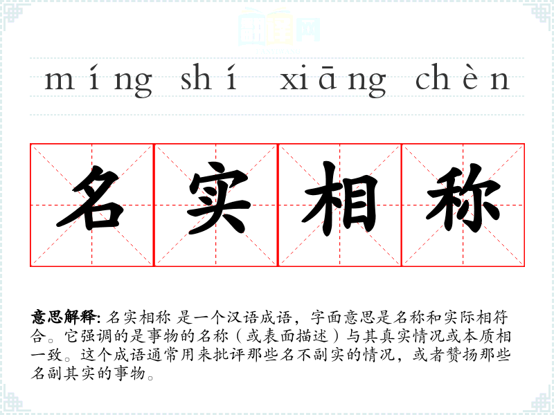 名实相称 是一个汉语成语,字面意思是名称和实际相符合。它强调的是事物的名称(或表面描述)与其真实情况或本质相一致。这个成语通常用来批评那些名不副实的情况,或者赞扬那些名副其实的事物。