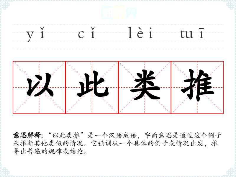 “以此类推”是一个汉语成语,字面意思是通过这个例子来推断其他类似的情况。它强调从一个具体的例子或情况出发,推导出普遍的规律或结论。