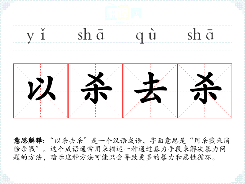 “以杀去杀”是一个汉语成语,字面意思是“用杀戮来消除杀戮”。这个成语通常用来描述一种通过暴力手段来解决暴力问题的方法,暗示这种方法可能只会导致更多的暴力和恶性循环。