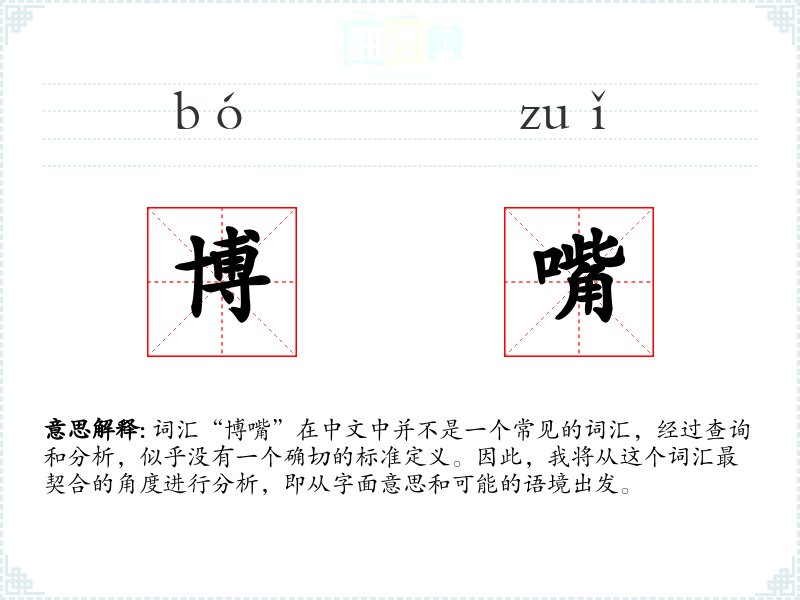 “博嘴”字面意思可能是指“广泛地说话”或“说话多”,其中“博”通常有广泛、丰富的含义,而“嘴”则指说话的器官。