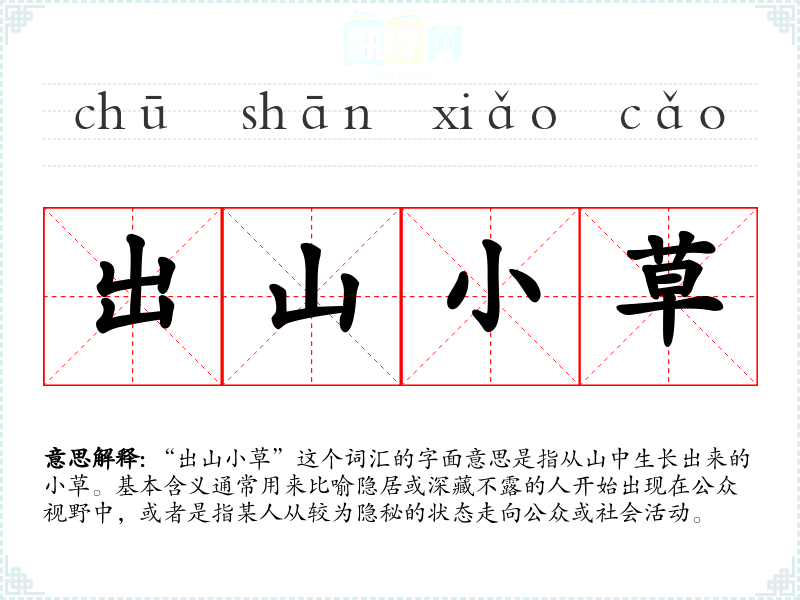 “出山小草”这个词汇的字面意思是指从山中生长出来的小草。基本含义通常用来比喻隐居或深藏不露的人开始出现在公众视野中,或者是指某人从较为隐秘的状态走向公众或社会活动。