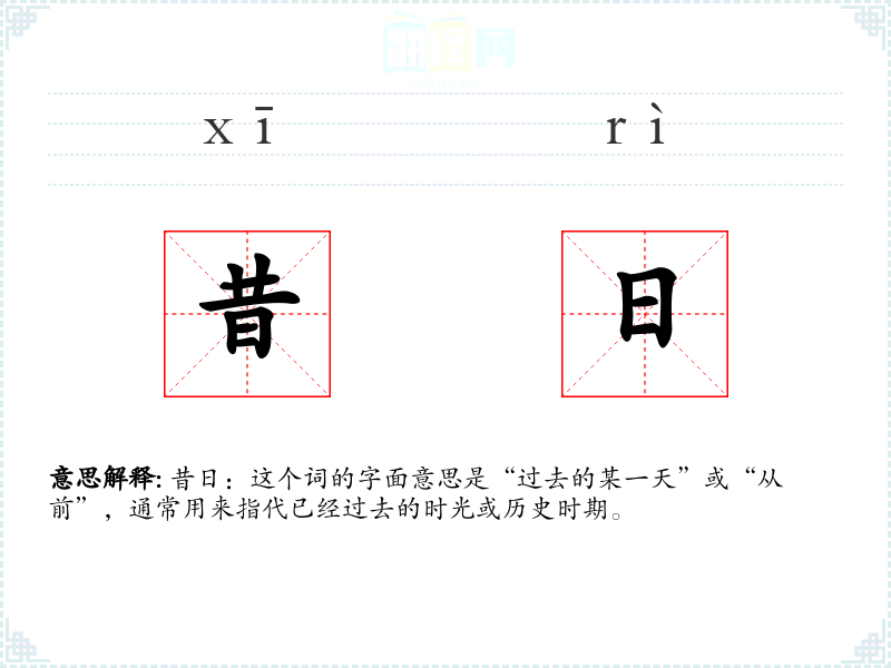 昔日:这个词的字面意思是“过去的某一天”或“从前”,通常用来指代已经过去的时光或历史时期。