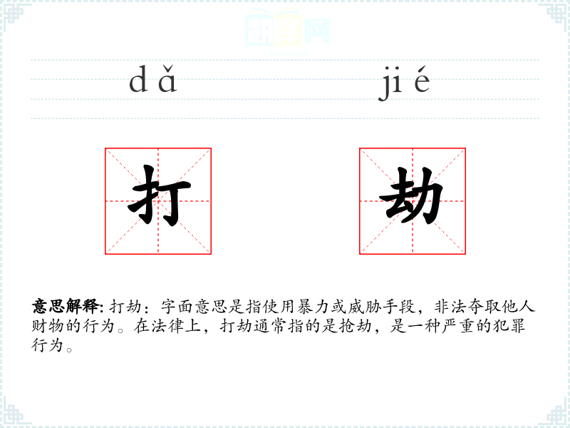 打劫:字面意思是指使用暴力或威胁手段,非法夺取他人财物的行为。在法律上,打劫通常指的是抢劫,是一种严重的犯罪行为。
