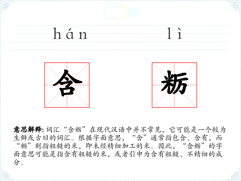 - 理解:含粝是一个具有特定文化背景和历史意义的词汇,虽然在现代汉语中不常见,但在学习和理解古代文学和历史时具有一定的价值。