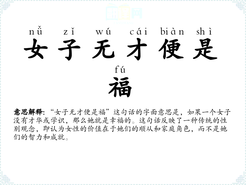 “女子无才便是福”这句话的字面意思是,如果一个女子没有才华或学识,那么她就是幸福的。这句话反映了一种传统的性别观念,即认为女性的价值在于她们的顺从和家庭角色,而不是她们的智力和成就。