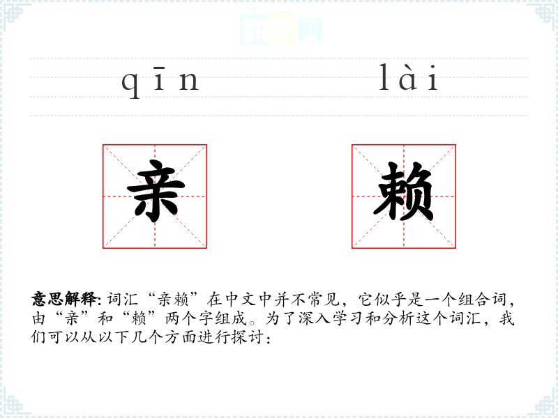 词汇“亲赖”在中文中并不常见,它似乎是一个组合词,由“亲”和“赖”两个字组成。为了深入学习和分析这个词汇,我们可以从以下几个方面进行探讨: