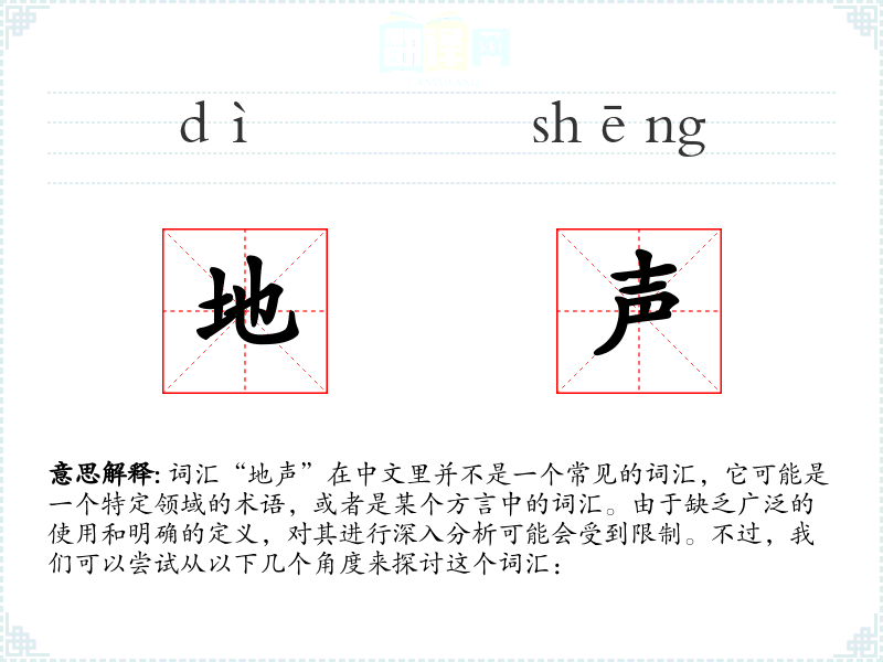 由于“地声”不是一个标准的中文词汇,我们无法给出一个确切的基本定义。它可能是指地面发出的声音,或者是某个特定情境下的声音描述。