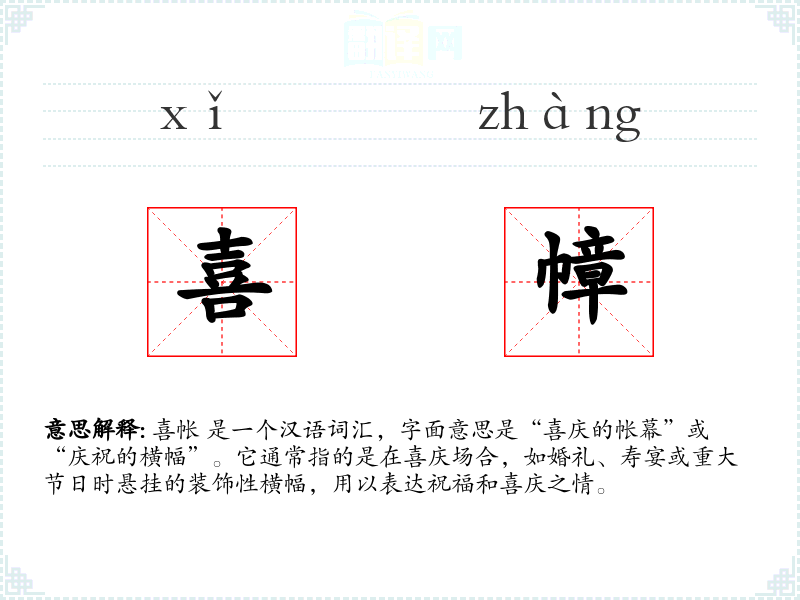 - 反义词:丧帐(用于丧事场合的横幅)