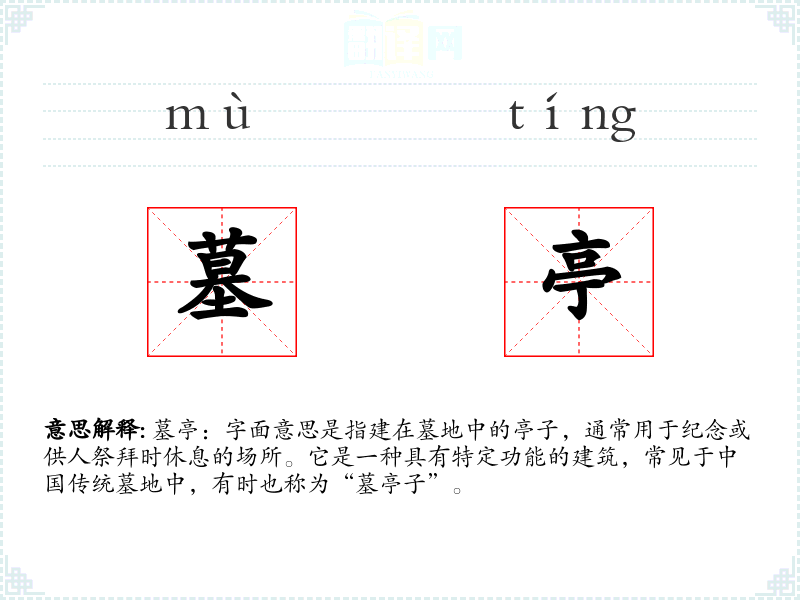 墓亭:字面意思是指建在墓地中的亭子,通常用于纪念或供人祭拜时休息的场所。它是一种具有特定功能的建筑,常见于**传统墓地中,有时也称为“墓亭子”。