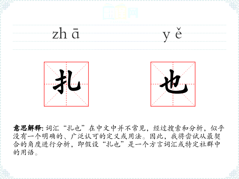 由于“扎也”不是一个标准汉语词汇,我们无法给出一个确切的基本定义。如果它是一个方言词汇,那么它的意思可能会根据具体的地理位置和社群而有所不同。