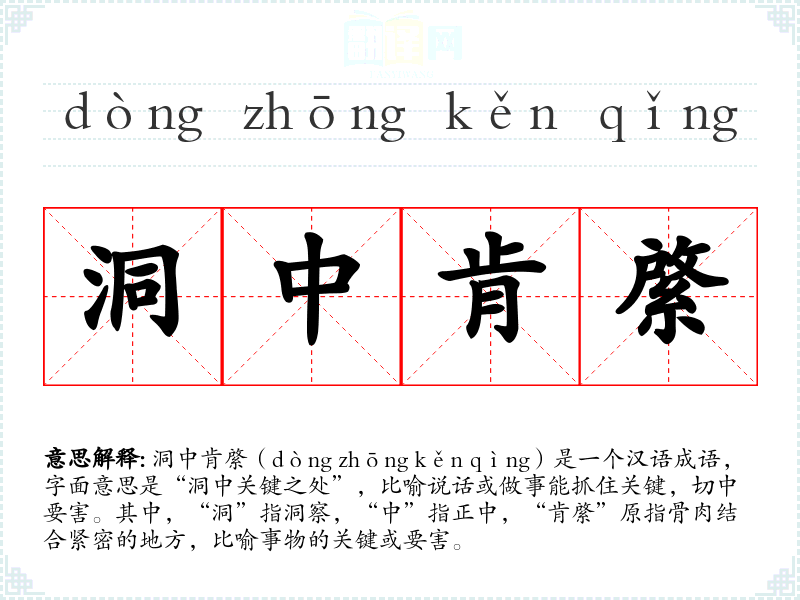 洞中肯綮(dòng zhōng kěn qìng)是一个汉语成语,字面意思是“洞中关键之处”,比喻说话或做事能抓住关键,切中要害。其中,“洞”指洞察,“中”指正中,“肯綮”原指骨肉结合紧密的地方,比喻事物的关键或要害。