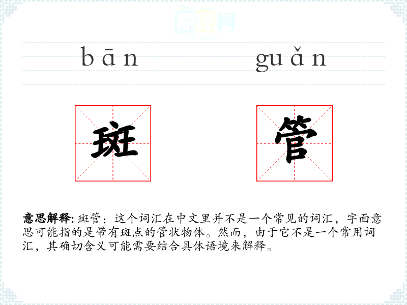 斑管:这个词汇在中文里并不是一个常见的词汇,字面意思可能指的是带有斑点的管状物体。然而,由于它不是一个常用词汇,其确切含义可能需要结合具体语境来解释。