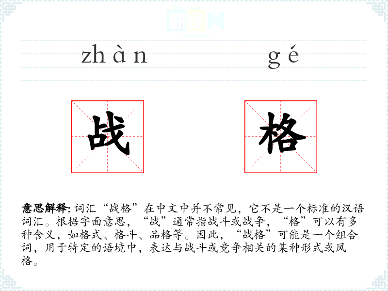词汇“战格”在中文中并不常见,它不是一个标准的汉语词汇。根据字面意思,“战”通常指战斗或战争,“格”可以有多种含义,如格式、格斗、品格等。因此,“战格”可能是一个组合词,用于特定的语境中,表达与战斗或竞争相关的某种形式或风格。