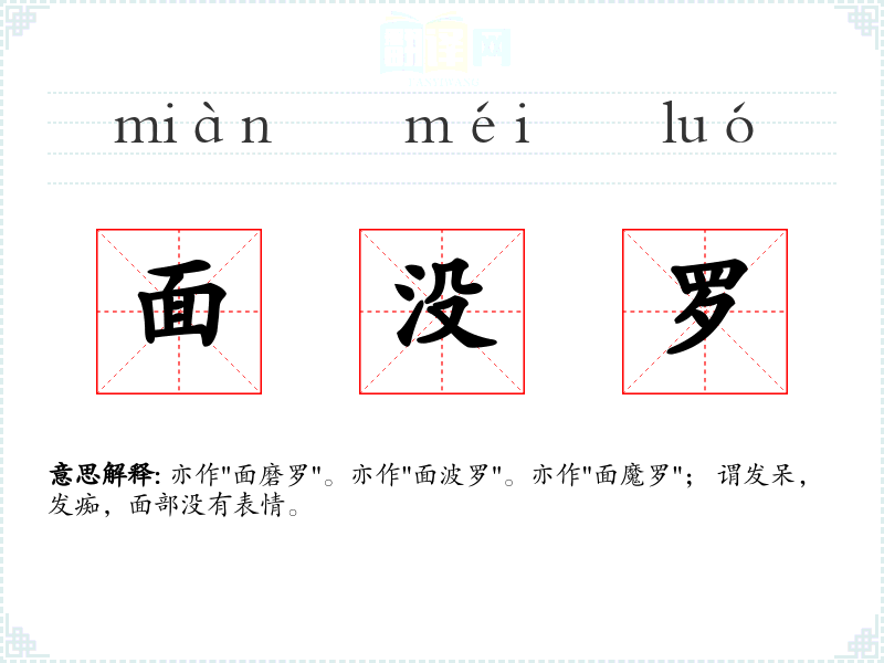 亦作"面磨罗"。亦作"面波罗"。亦作"面魔罗"; 谓发呆,发痴,面部没有表情。