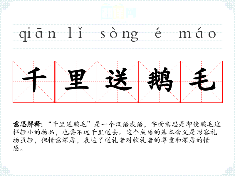 “千里送鹅毛”是一个汉语成语,字面意思是即使鹅毛这样轻小的物品,也要不远千里送去。这个成语的基本含义是形容礼物虽轻,但情意深厚,表达了送礼者对收礼者的尊重和深厚的情感。