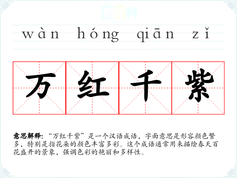 “万红千紫”这个成语不仅丰富了汉语的表达,也反映了中华文化对自然美的欣赏和赞美。在语言学*和表达中,掌握这样的成语可以增强语言的生动性和表现力。