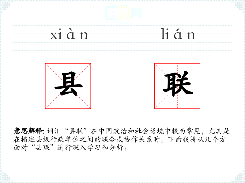 词汇“县联”在*政治和社会语境中较为常见,尤其是在描述县级行政单位之间的联合或协作关系时。下面我将从几个方面对“县联”进行深入学和分析:
