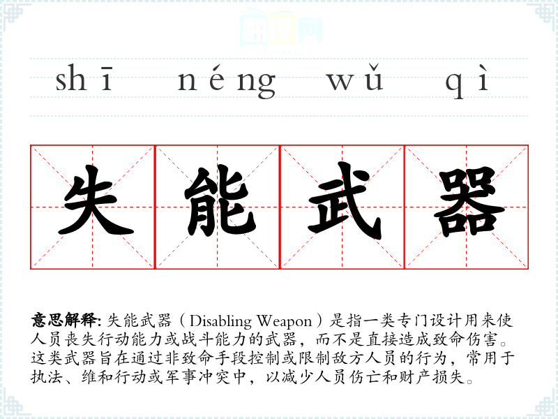 失能武器作为一个词汇,不仅反映了科技在军事和执法领域的应用,也触及了伦理、法律和社会责任等多重议题。在语言学*和表达中,理解和运用这一词汇有助于深化对现代社会复杂问题的认识。