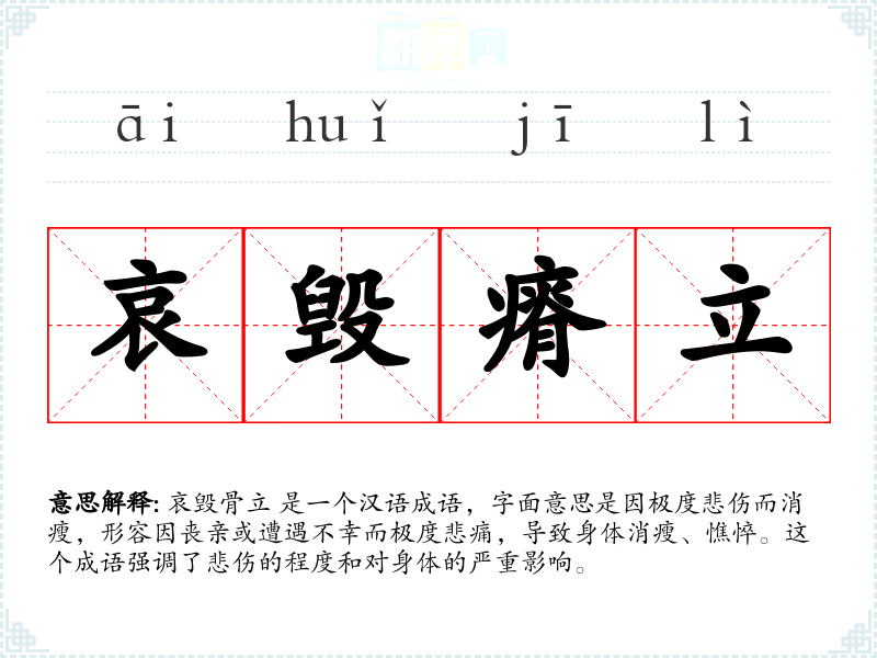 哀毁骨立 是一个汉语成语,字面意思是因极度悲伤而消瘦,形容因丧亲或遭遇不幸而极度悲痛,导致身体消瘦、憔悴。这个成语强调了悲伤的程度和对身体的严重影响。
