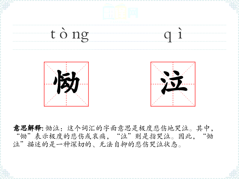 恸泣:这个词汇的字面意思是极度悲伤地哭泣。其中,“恸”表示极度的悲伤或哀痛,“泣”则是指哭泣。因此,“恸泣”描述的是一种深切的、无法自抑的悲伤哭泣状态。