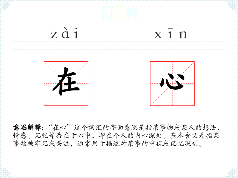 “在心”这个词汇的字面意思是指某事物或某人的想法、情感、记忆等存在于心中,即在个人的内心深处。基本含义是指某事物被牢记或关注,通常用于描述对某事的重视或记忆深刻。