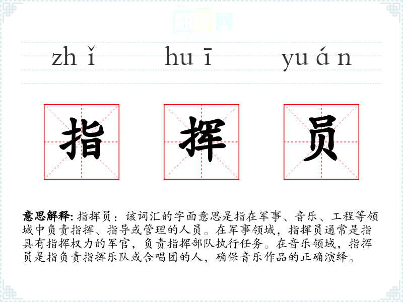 指挥员:该词汇的字面意思是指在军事、音乐、工程等领域中负责指挥、指导或管理的人员。在军事领域,指挥员通常是指具有指挥权力的军官,负责指挥部队执行任务。在音乐领域,指挥员是指负责指挥乐队或合唱团的人,确保音乐作品的正确演绎。