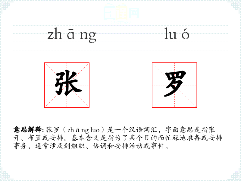 张罗(zhāng luo)是一个汉语词汇,字面意思是指张开、布置或安排。基本含义是指为了某个目的而忙碌地准备或安排事务,通常涉及到组织、协调和安排活动或**。