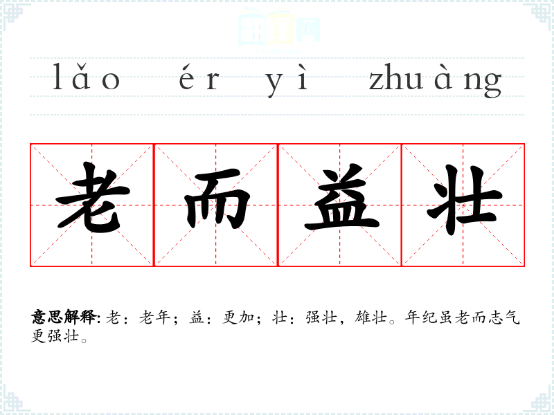 老:老年;益:更加;壮:强壮,雄壮。年纪虽老而志气更强壮。