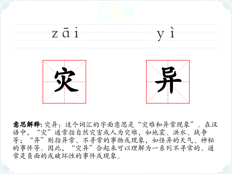 灾异:这个词汇的字面意思是“灾难和异常现象”。在汉语中,“灾”通常指自然灾害或人为灾难,如地震、洪水、战争等;“异”则指异常、不寻常的事物或现象,如怪异的天气、神秘的等。因此,“灾异”合起来可以理解为一系列不寻常的、通常是负面的或破坏性的或现象。