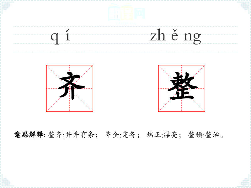 ; 齐全;完备; 端正;漂亮; 整顿;整治。