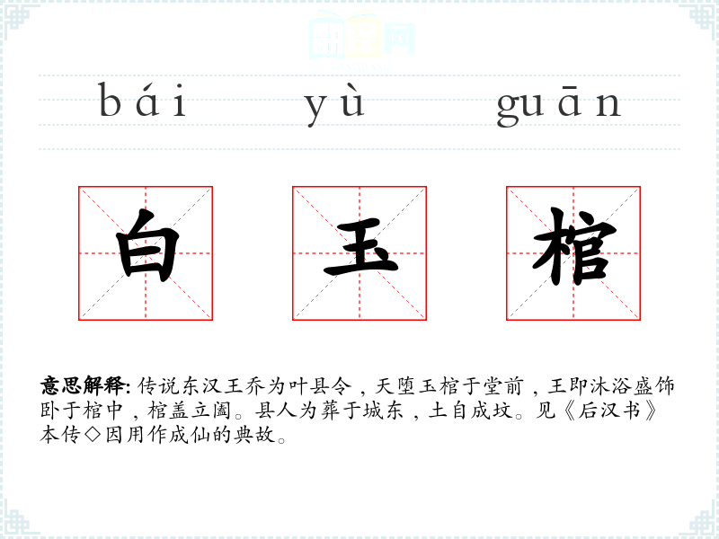 传说东汉王乔为叶县令﹐天堕玉棺于堂前﹐王即沐浴盛饰卧于棺中﹐棺盖立阖。县人为葬于城东﹐土自成坟。见《后汉书》本传◇因用作成仙的典故。