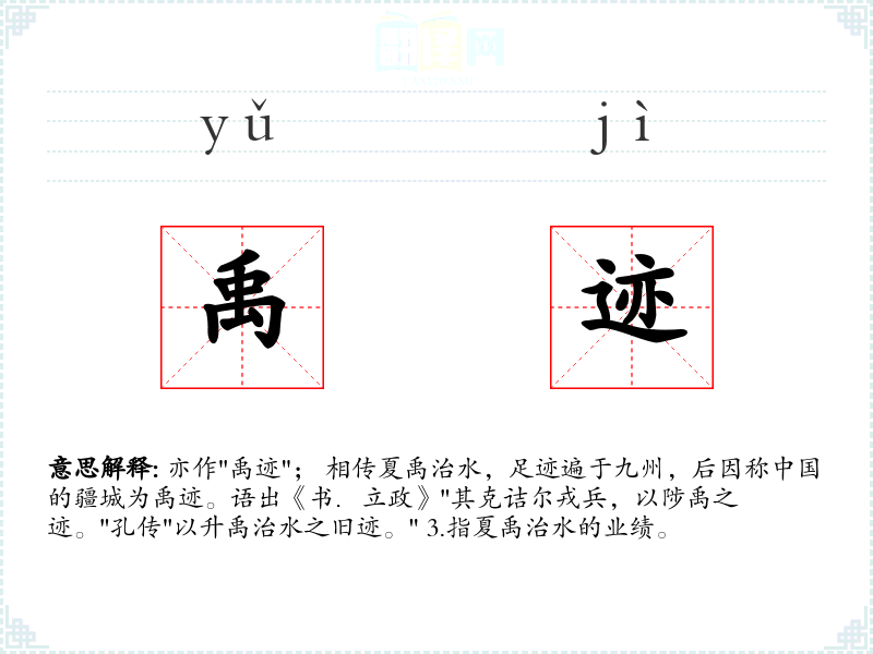 亦作"禹迹"; 相传夏禹治水,足迹遍于九州,后因称中国的疆城为禹迹。语出《书.立政》"其克诘尔戎兵,以陟禹之迹。"孔传"以升禹治水之旧迹。" 3.指夏禹治水的业绩。