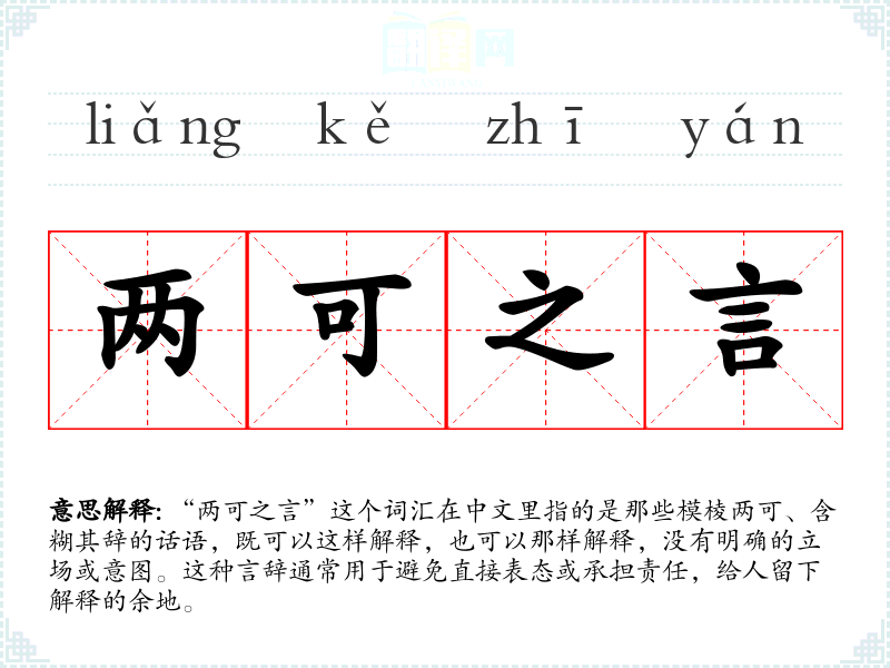 “两可之言”这个词汇在中文里指的是那些模棱两可、含糊其辞的话语,既可以这样解释,也可以那样解释,没有明确的立场或意图。这种言辞通常用于避免直接表态或承担责任,给人留下解释的余地。