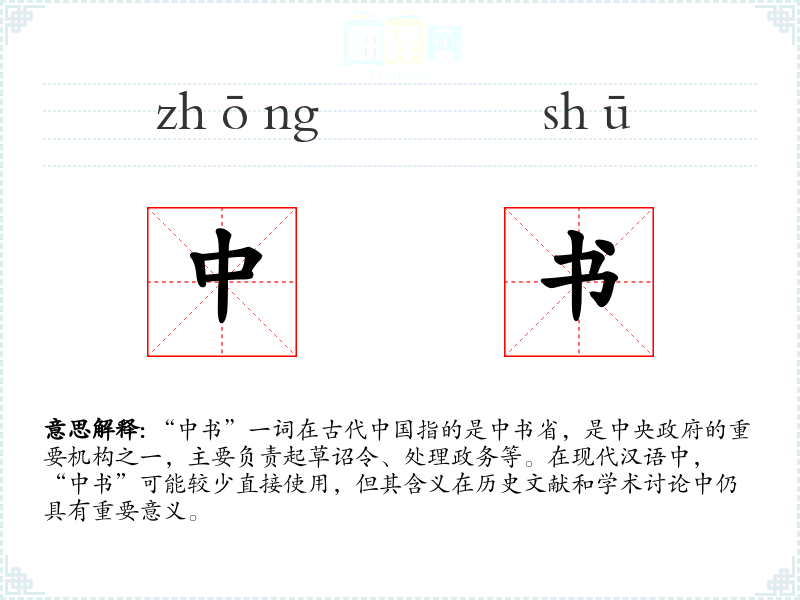 “中书”一词在古代**指的是中书省,是中央政府的重要机构之一,主要负责起草诏令、处理政务等。在现代汉语中,“中书”可能较少直接使用,但其含义在历史文献和学术讨论中仍具有重要意义。