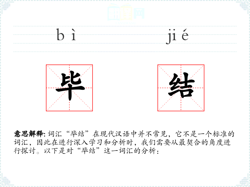 “毕结”不是一个标准的汉语词汇,它可能是由两个字“毕”和“结”组合而成的。字面意思可能是“完成”和“结束”的结合,但这种组合在标准汉语中并不常见。