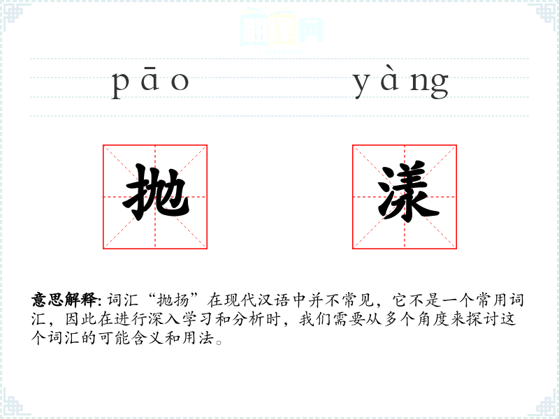 词汇“抛扬”在现代汉语中并不常见,它不是一个常用词汇,因此在进行深入学*和分析时,我们需要从多个角度来探讨这个词汇的可能含义和用法。