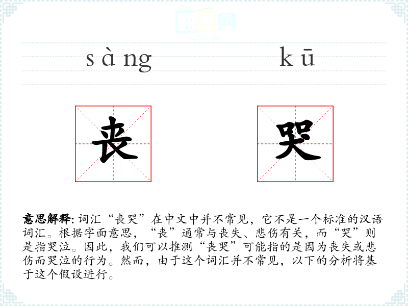 词汇“丧哭”在中文中并不常见,它不是一个标准的汉语词汇。根据字面意思,“丧”通常与丧失、悲伤有关,而“哭”则是指哭泣。因此,我们可以推测“丧哭”可能指的是因为丧失或悲伤而哭泣的行为。然而,由于这个词汇并不常见,以下的分析将基于这个假设进行。