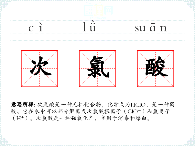 - 专业领域:在化学和环境科学中,次氯酸常用于讨论消毒剂、水处理和漂白剂。