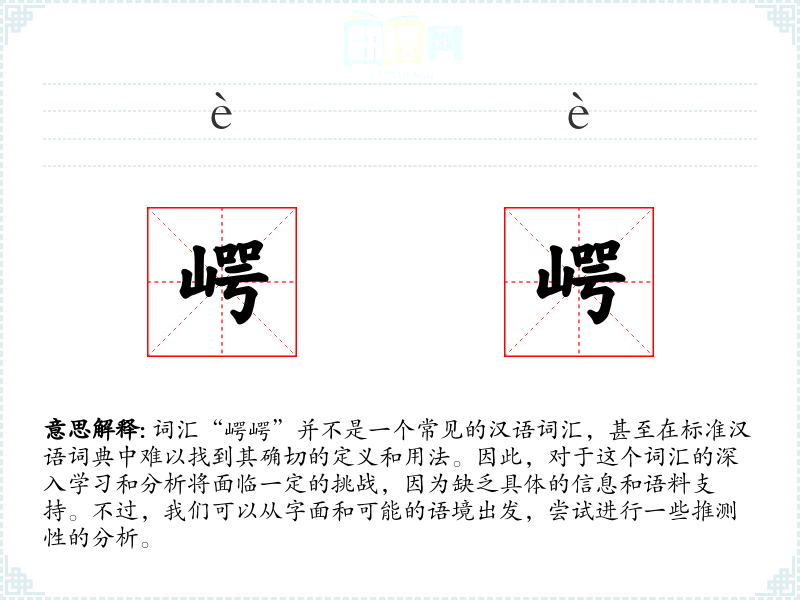 词汇“崿崿”并不是一个常见的汉语词汇,甚至在标准汉语词典中难以找到其确切的定义和用法。因此,对于这个词汇的深入学习和分析将面临一定的挑战,因为缺乏具体的信息和语料支持。不过,我们可以从字面和可能的语境出发,尝试进行一些推测性的分析。
