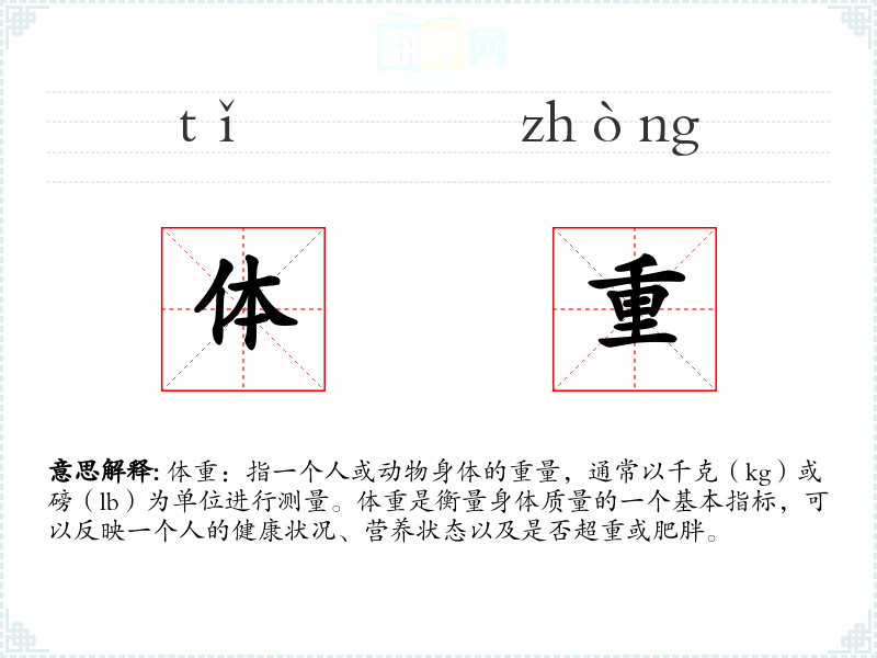 "体重"的意思解释、体重是什么意思由翻译网汉语词典查词提供。