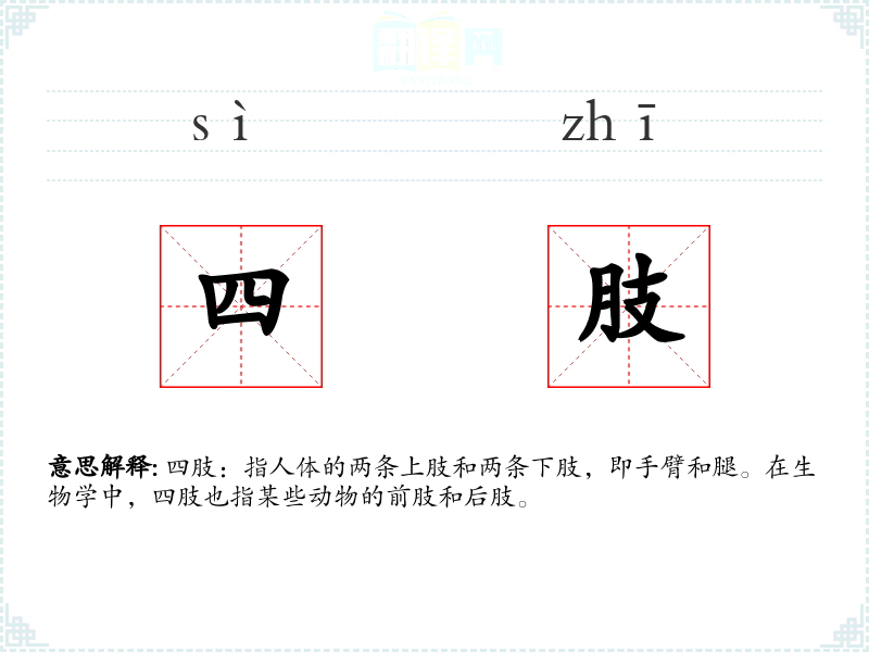 - 反义词:无(四肢是人体的基本组成部分,没有直接的反义词)