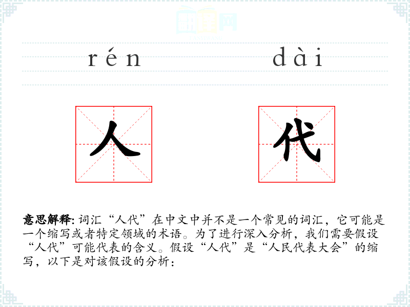 词汇“人代”在中文中并不是一个常见的词汇,它可能是一个缩写或者特定领域的术语。为了进行深入分析,我们需要假设“人代”可能代表的含义。假设“人代”是“人民代表大会”的缩写,以下是对该假设的分析: